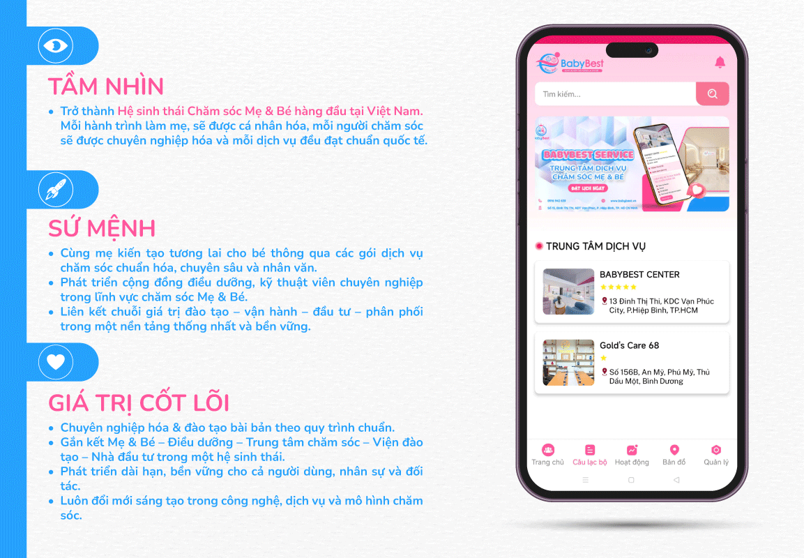 BabyBest không đơn giản chỉ là một thương hiệu Chăm sóc Mẹ & Bé. Đó là một Hệ sinh thái khép kín và kết nối, nơi mọi yếu tố từ con người, quy trình đến công nghệ được quy hoạch để mang đến trải nghiệm tối ưu cho mẹ và bé trên toàn hành trình phát triển. Là cầu nối để trung tâm chăm sóc gắn với Mẹ & Bé, Mẹ & Bé gắn với điều dưỡng – kỹ thuật viên, điều dưỡng – kỹ thuật viên gắn với viện đào tạo; góp phần vào xây dựng hệ sinh thái dịch vụ chất lượng cao, bền vững.